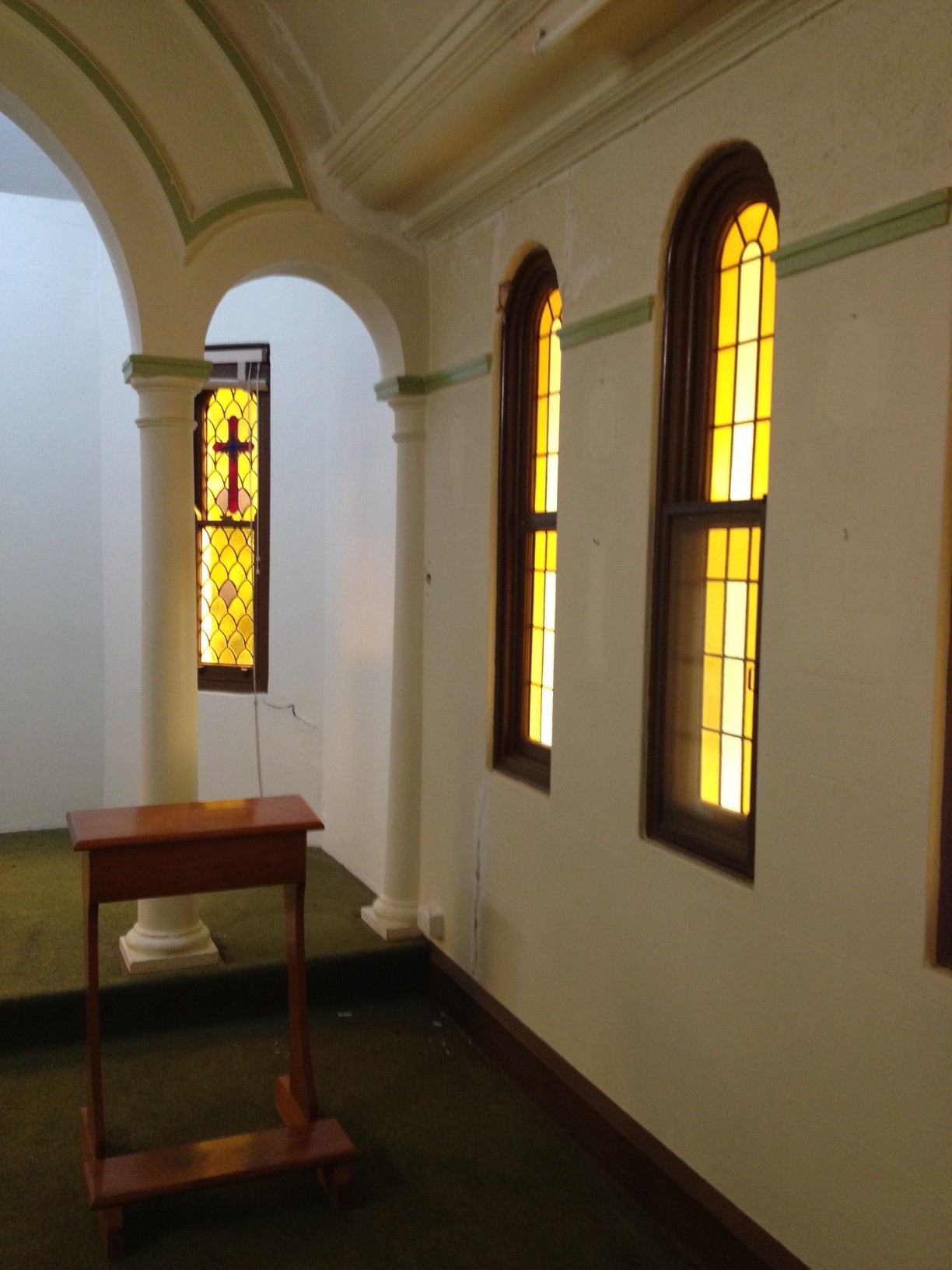 ImageImageThe Chapel is an intimate but a good size room. It has beautiful attention to detail without being ornate – with gentle arches and raised floor, amber leadlight windows which face the front as well as, interestingly, the internal passage, and lovely coloured leadlight cross windows which catch the setting sun late in the afternoons. The front windows face the front porch and the leadlight windows look beautiful from the street when the chapel lights are turned on at night.