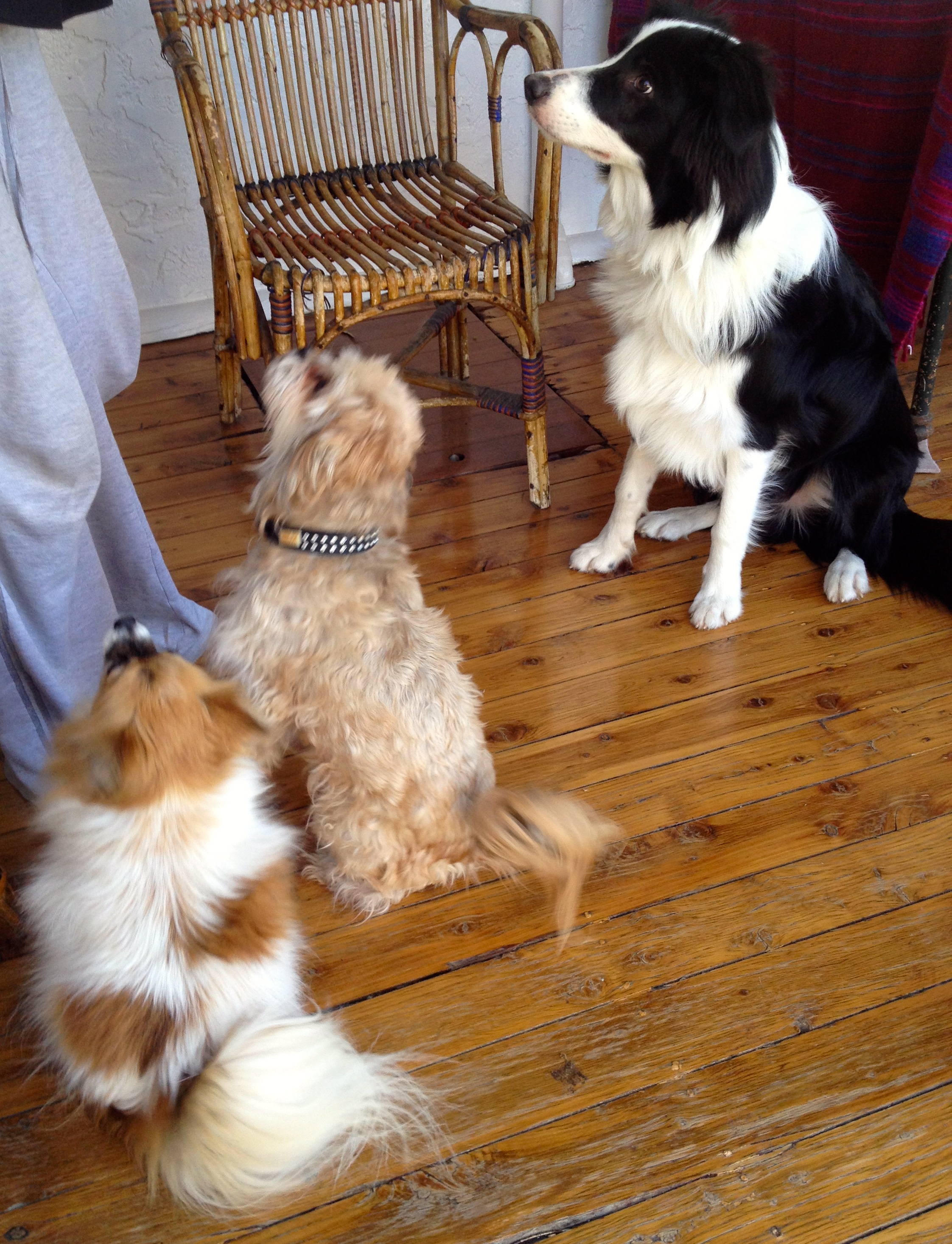 Food is a social tool. We are putting effort into training Popcorn whilst he is here and using it as an opportunity to refresh the smaller versions who, I must admit, were never greatly trained. It’s funny to see the three of them trying to please with their sits, drops and stays for treats – all hostility and avoidance is quickly forgotten.