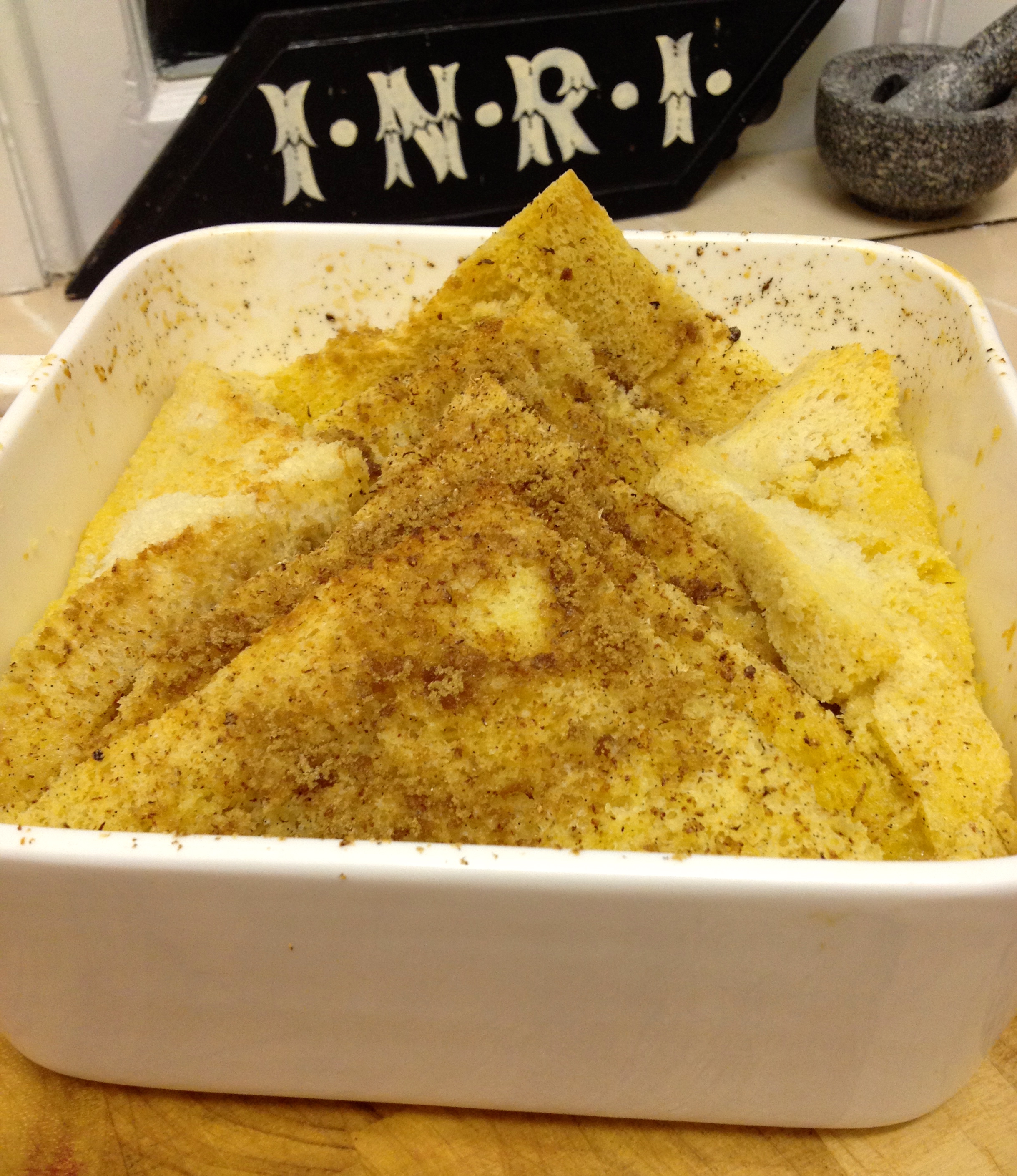 - Butter bread, cut into triangles and place in dish