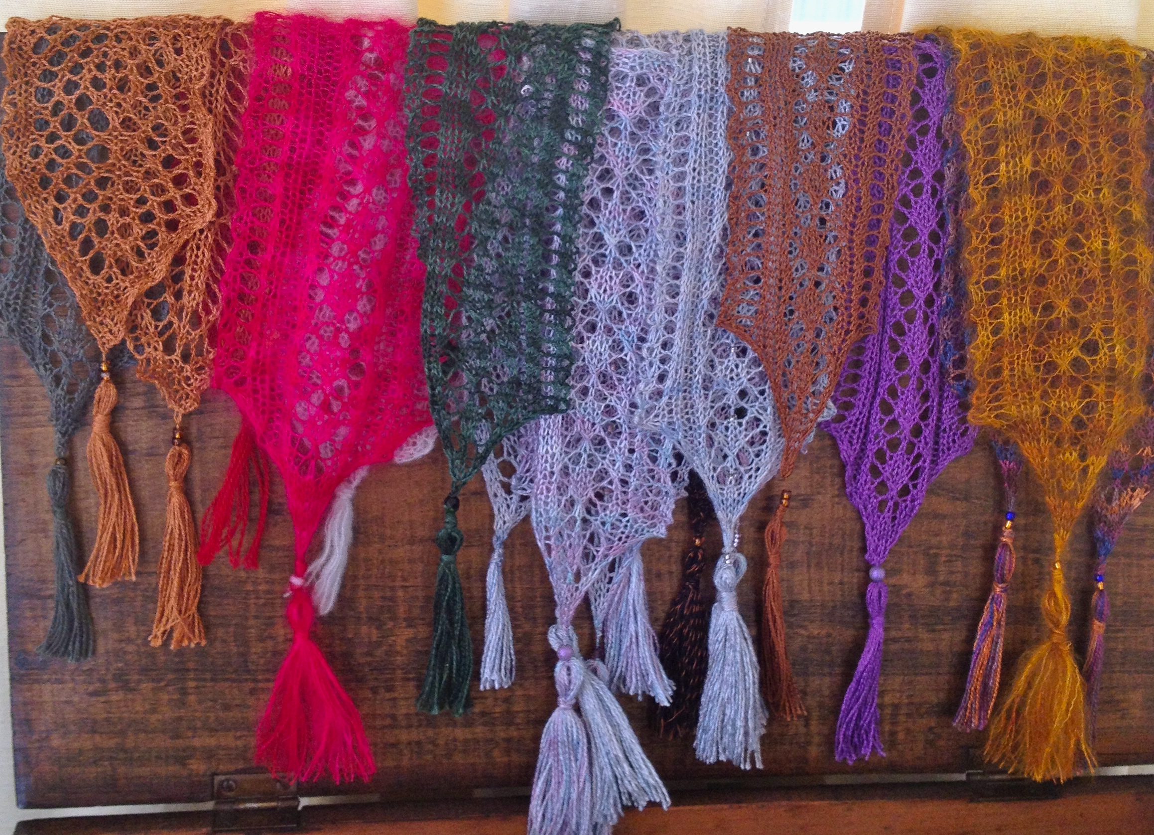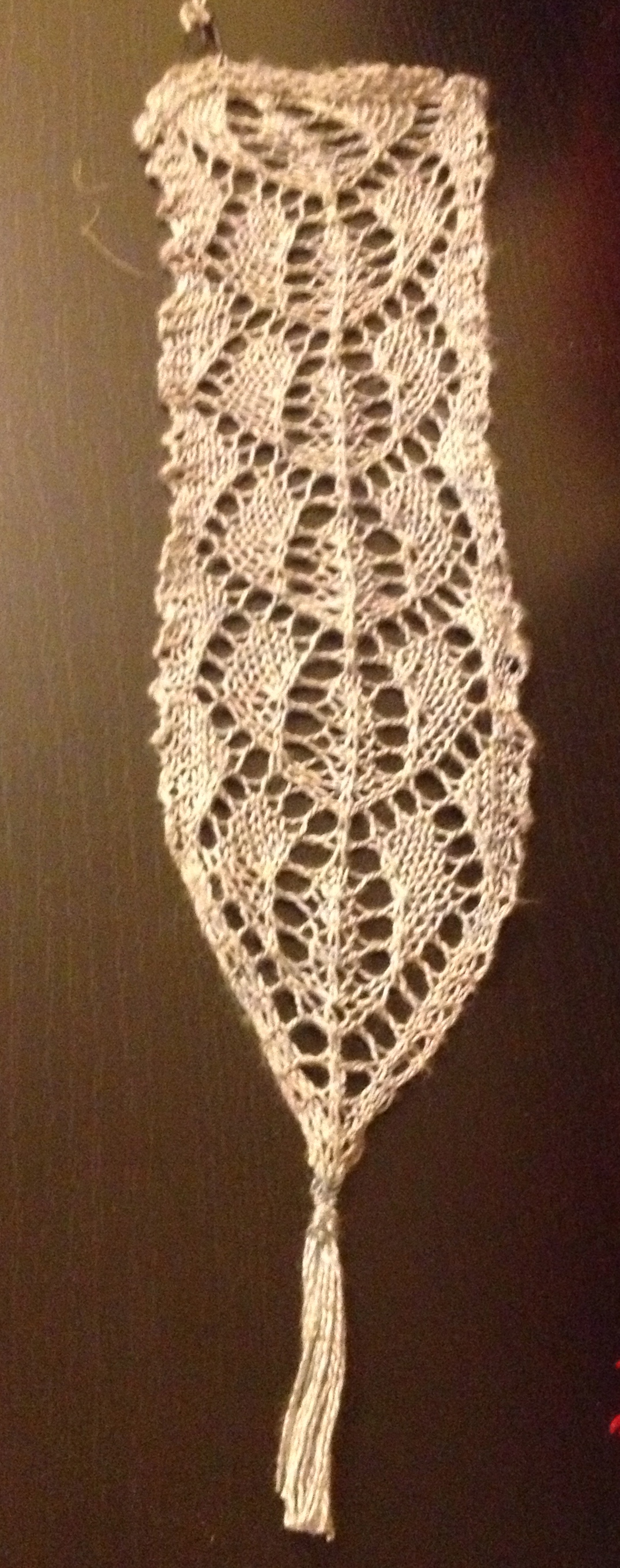 At this stage I’m using laceweight yarn with the silk and mohair being my preference. The tassels are fun but I haven’t mastered the art of attaching them neatly to the bookmarks – there are a few failures there.