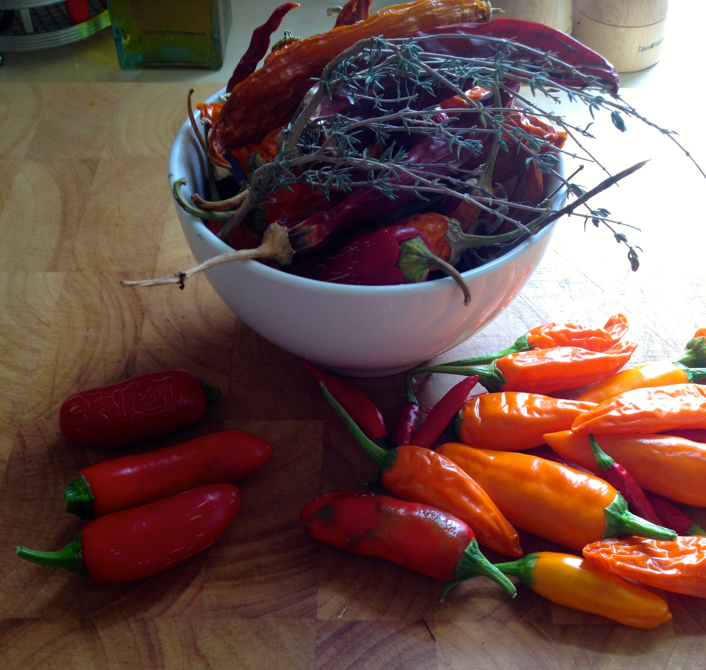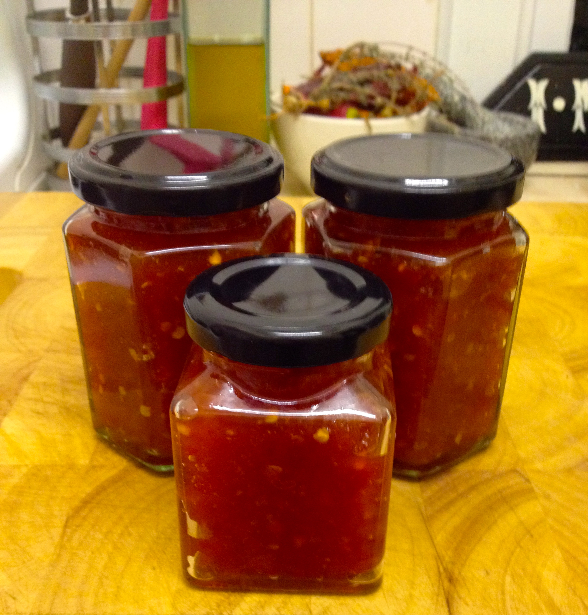 The chillies are abundant at the moment, particularly the orange Siam, the tiny bird’s eye Thai and the Jalapeño, so some bottled chilli stuff seems like a good idea. I already have chilli oil in bottles so am trying Chilli Jam for the first time. Some Sweet Chilli Sauce is also going into the pantry.