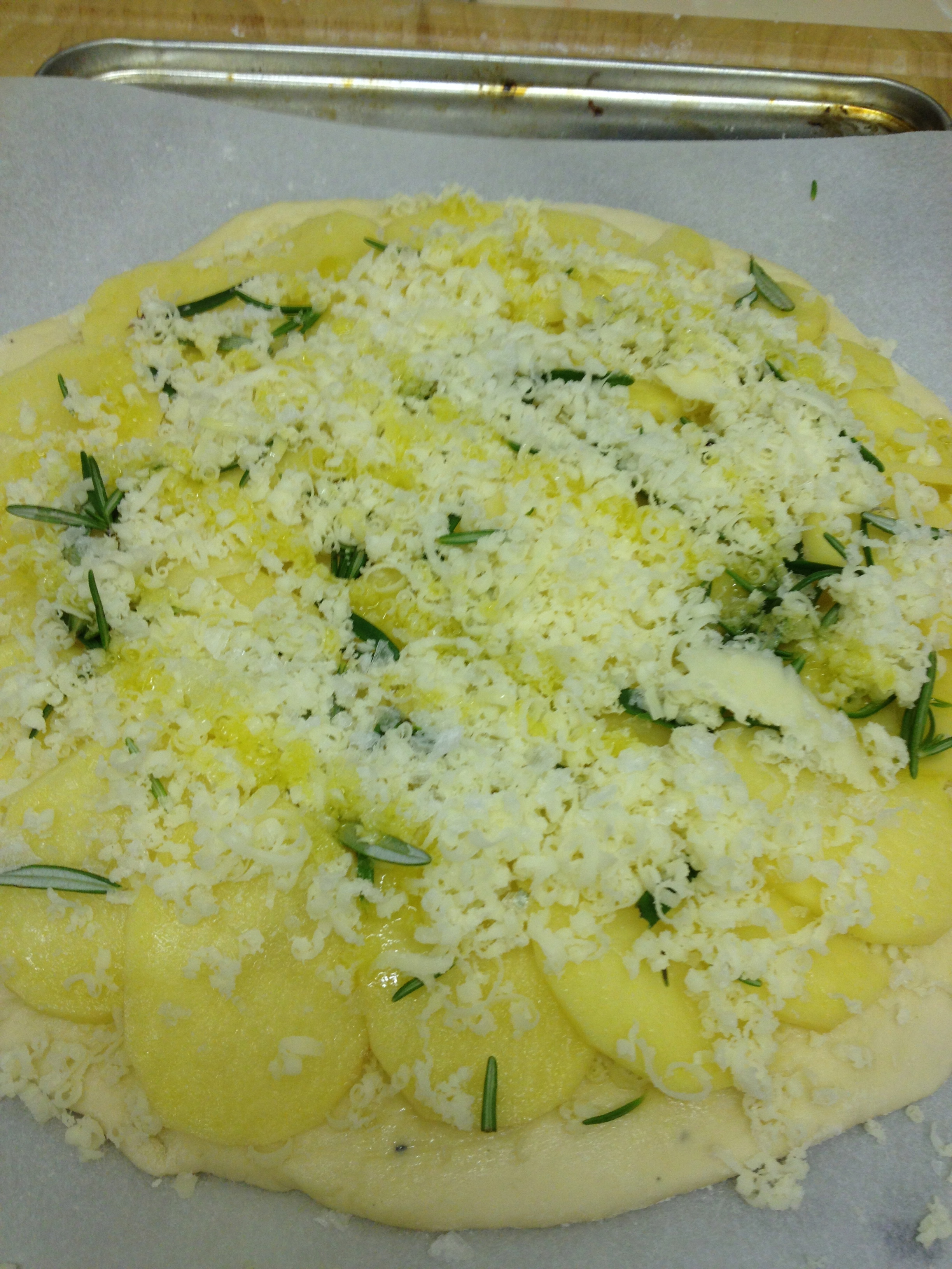 Put Mozarella on base, holding a little back. Spread potatoes out on base, sprinkle with Rosemary leaves and sea salt. Add some more Mozarella, drizzle with Olive Oil.