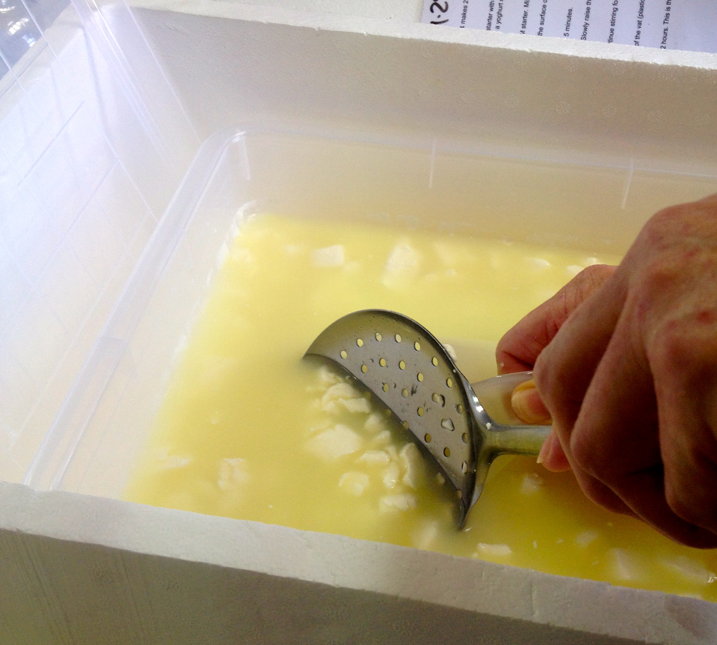 Turning the whey – after gently heating milk and mixing in rennet and bacteria or starter. Then letting it set a little and cutting it.